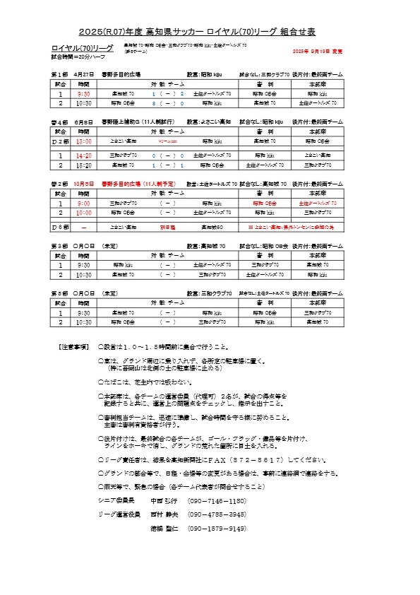 2025年ロイヤル(70)リーグ日程表(9月19日変更)