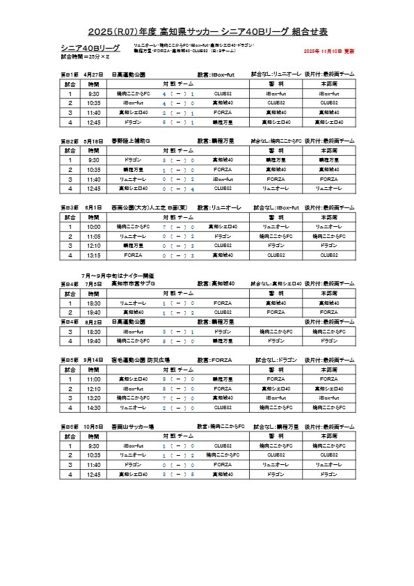 2025年シニア40Bリーグ日程表(11月10日更新)