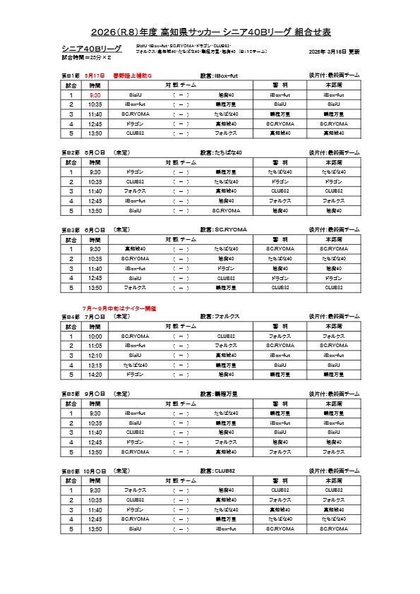 2026年シニア40Bリーグ日程表(3月18日更新)