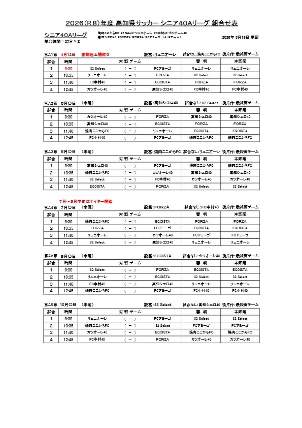 2026年シニア40Aリーグ日程表(3月18日更新)