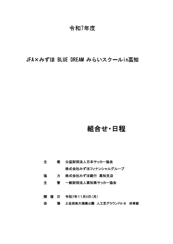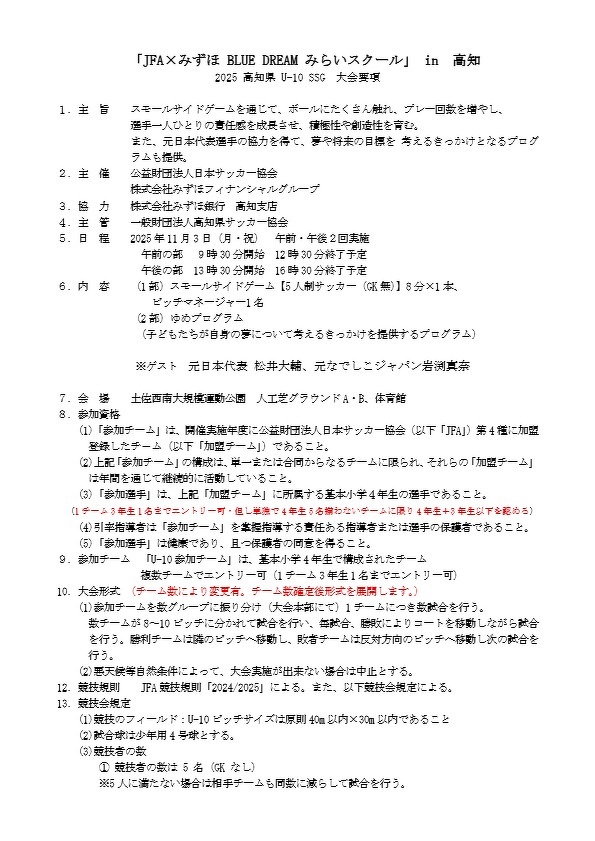 「JFA×みずほ BLUE DREAM みらいスクール」 in 高知 2025 高知県U―10 SSG 大会 2025.10.07 「JFA×みずほ BLUE DREAM みらいスクール」 in 高知 2025 高知県U―10 SSG 大会要項 組み合わせ等