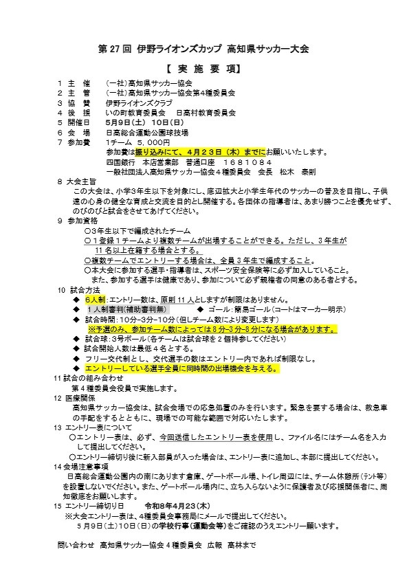 第27回 伊野ライオンズカップ 高知県サッカー大会 要項